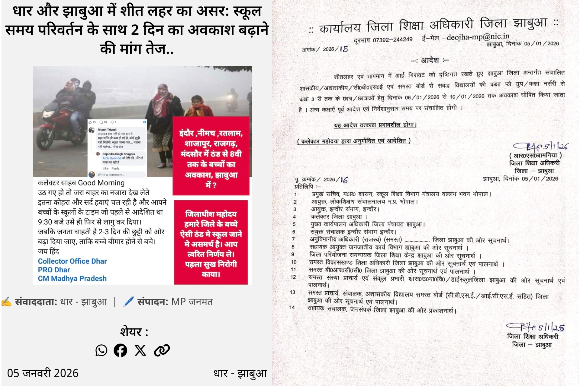 एमपी जनमत में प्रकाशित खबर का असर : झाबुआ में शीत लहर के चलते नर्सरी से कक्षा 3 तक 5 दिन का अवकाश घोषित...