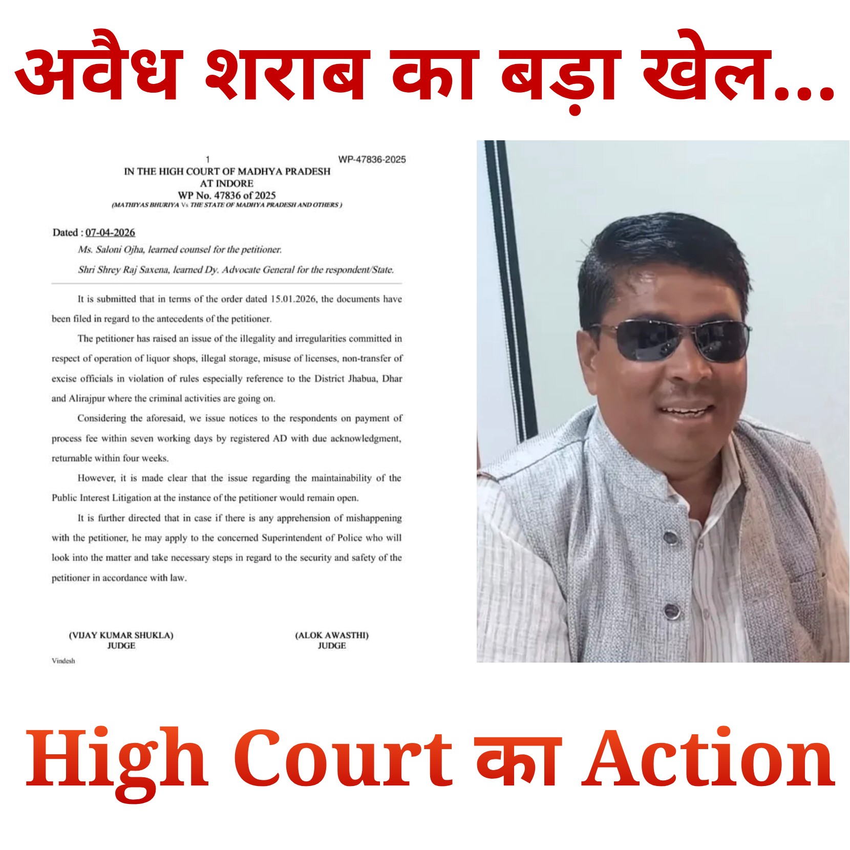 इंदौर/झाबुआ। मध्यप्रदेश के झाबुआ, अलीराजपुर और धार जिलों में कथित अवैध शराब परिवहन, लाइसेंस के दुरुपयोग और प्रशासनिक मिलीभगत के गंभीर आरोप अब हाईकोर्ट तक पहुंच गए हैं... इस मामले में दायर जनहित याचिका पर माननीय उच्च न्यायालय इंदौर खंडपीठ ने सख्त रुख अपनाते हुए संबंधित अधिकारियों और शराब ठेकेदारों को नोटिस जारी कर दिए हैं...
